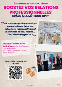 Le mardi 10 mars 2026, Vakom Angers et PEPINA s’associent pour organiser un atelier-conférence autour des relations interpersonnelles et notamment dans le monde du travail grâce à la 𝐦𝐞́𝐭𝐡𝐨𝐝𝐞 𝐎𝐏𝐑®.